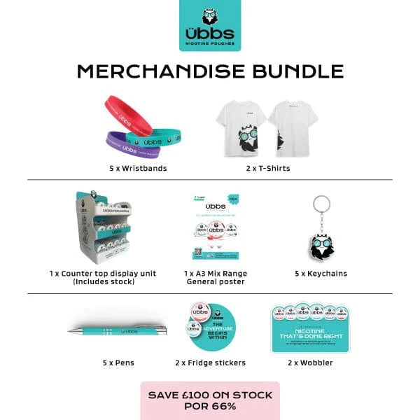 The Ubbs Nicotine Pouch CDU Bundle, featuring strengths of 6mg, 11mg, and 14mg, is the perfect solution for retail store owners seeking to stock up on this popular tobacco-free alternative. This bundle includes 120 cans of Ubbs Nicotine Pouch with 20 pouches in each, giving a total of 2,400 pouches. Made with plant-based ingredients and triple lab tested, the signature Berry, Menthol, and Peppermint flavors offer a high-quality, clean alternative to traditional nicotine products. To elevate the retail experience, the bundle comes with a Counter Top Display Unit for eye-catching product showcasing. And to top it all off, the bundle includes promotional materials like wrist bands, T-shirts, posters, and more, allowing retailers to create a branded and engaging display. This all-in-one package is the ultimate solution for retailers looking to introduce or expand their offerings of Ubbs Nicotine Pouch, appealing to both new and experienced users.